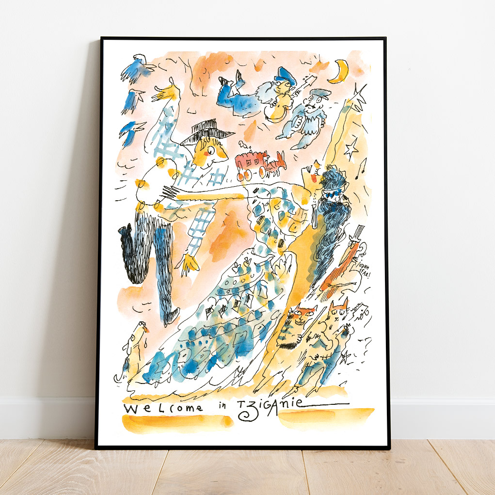 Affiche inédite de Joann Sfar, célèbre auteur de bande dessinée (« Le Chat du Rabbin », « Klezmer »…), spéciale Welcome in Tziganie.